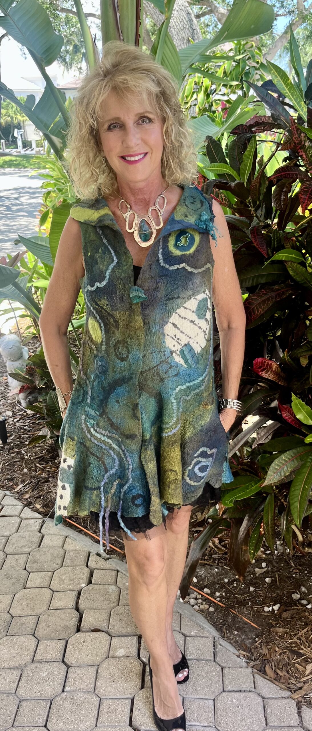 Exploring the art of knitting led me to discover the process of Nuno felting; the migration of fine wool through silk creating a lightweight durable fabric. Soap, water, and agitation are my tools. Garments are constructed through this technique; they are not sewn. My contemporary designs are one-of-a-kind. I use bold colors and varied textures to create sculptural statement pieces. I custom fit each felted piece for you personally. Through my creative outlet of Nuno felting , my technicolor imagination allows me to pursue an eclectic collection of artist-made original textile designs.